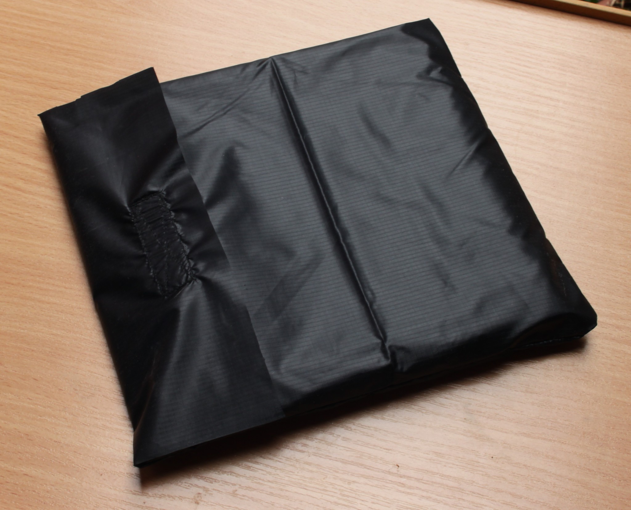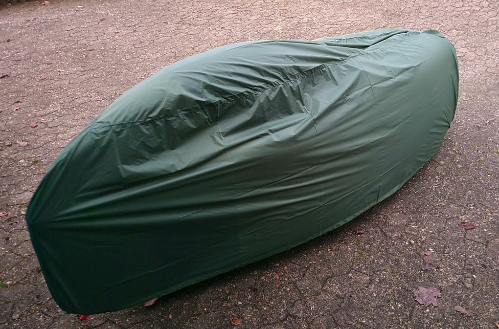 A velomobile cover made of silnylon, an extremely tear-resistant and lightweight fabric coated with silicone. The coating renders the fabric (not the seams) waterproof, additional coating of the seams is available on request (+ 10 €).