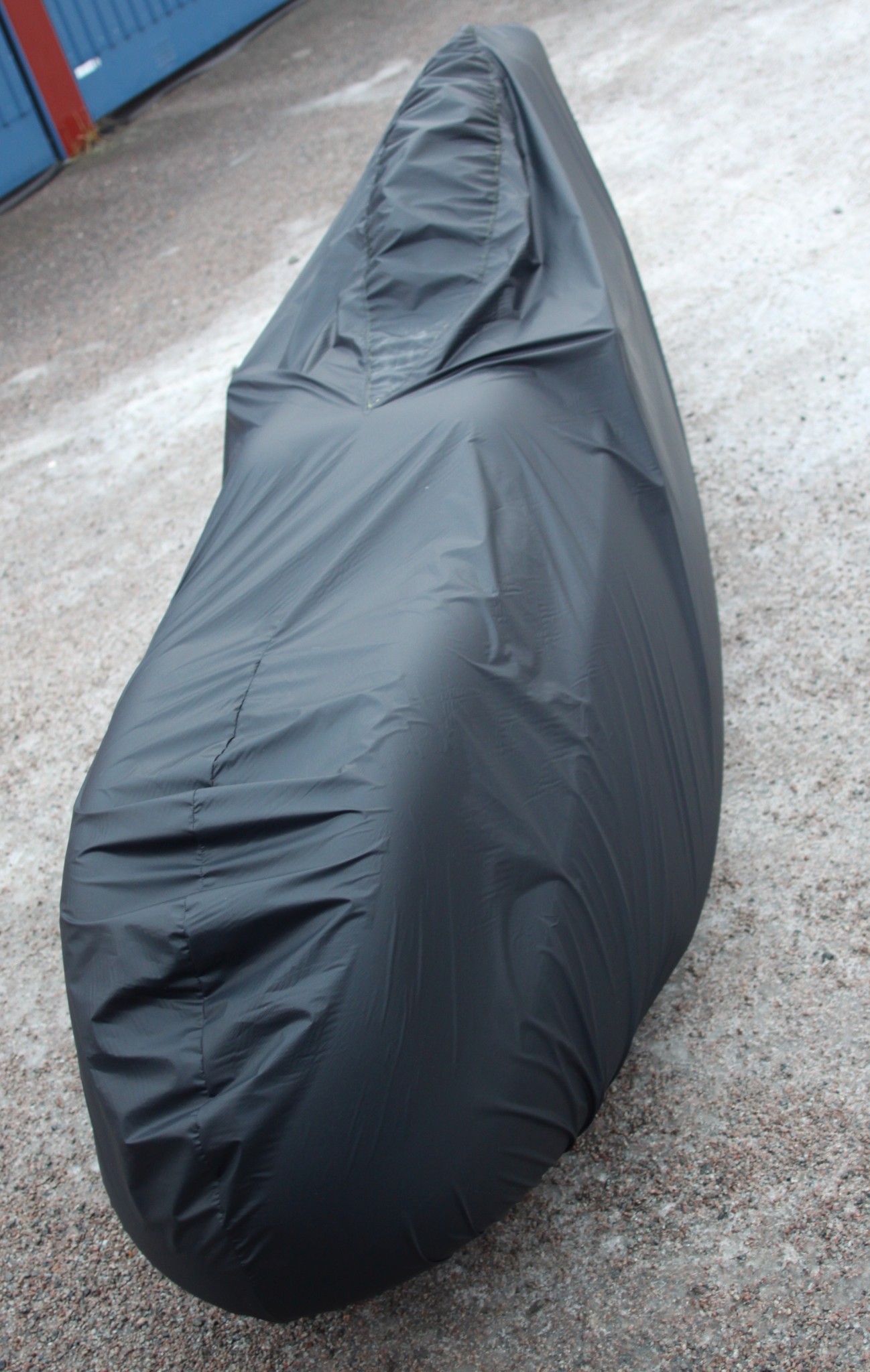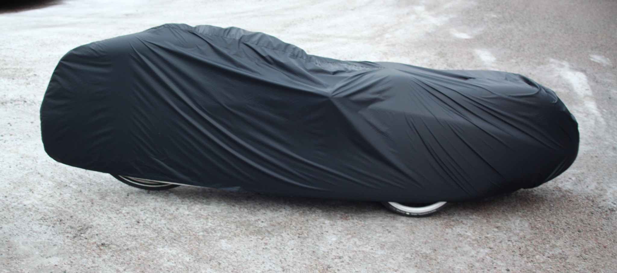 A velomobile cover made of silnylon, an extremely tear-resistant and lightweight fabric coated with silicone.